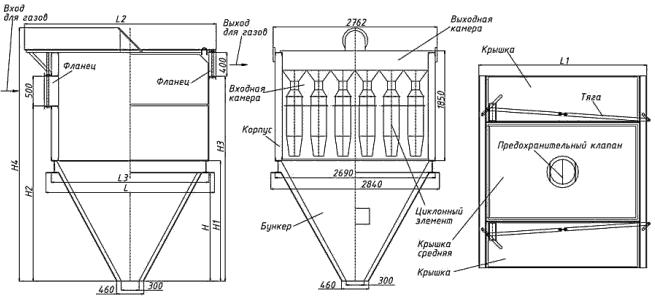 Батарейные циклоны БЦ-254-2-5x(3+2) — это ряд параллельно расположенных циклонных элементов в общем стальном корпусе с общим двухкамерным бункером. Количество циклонных элементов, расположенных в корпусе, определяется производительностью. Обычно это 20-56 элементов диаметром 254 мм. Каждый из них имеет две параллельно функционирующие секции с предохранительными клапанами, которые защищают устройство от повреждений на случай взрыва. Если нагрузка на циклон недостаточно высокая, при помощи шибера можно отключить одну из камер и циклон будет работать в половину своих возможностей.